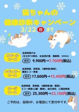 ねこちゃんの冬の健康診断キャンペーンのお知らせ🐱 2026年1月21日 (水) カテゴリー:お知らせ こんにちは✨2026年になり、1月も早くも後半戦となりましたね。本年もよろしくお願いいたします。さっそくですが、2026年はじめのキャンペーンのお知らせです。1/27(火)~3/22(日)までねこちゃんの健康診断キャンペーンが始まります🏥大切な家族の病気の早期発見にこのキャンペーンをご活用ください‼️ラージコースはお電話・当院受付でのご予約、スモールコース・レギュラーコースはインターネットでのご予約も承っております😀ご不明な点がありましたら、当院(☎︎048-626-6526)までお問い合わせください🐈武蔵浦和どうぶつ病院 さいたま市 南区 浦和区 戸田市 一覧へ戻る 次の記事へ
